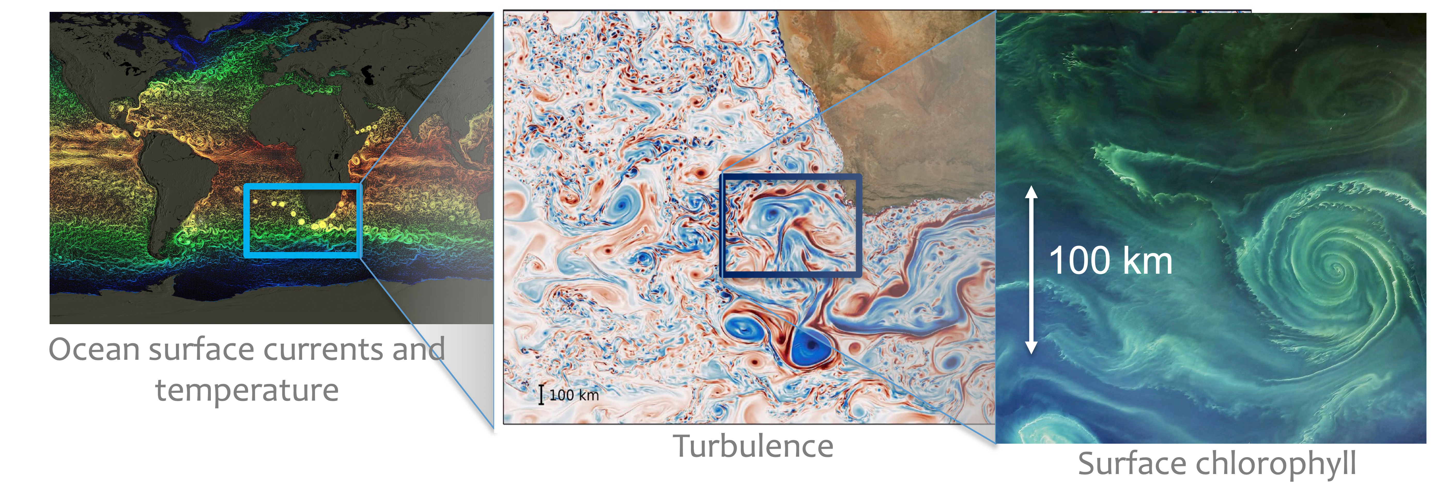 Graphic: Zooming into the study region: Left: The global ocean mesoscale (10-100 kilometres) dynamics captured by a global model, Credit: MIT/JPL and NASA/Goddard Space Flight Center Scientific Visualization Studio. Centre: Actual modelling capabilities that simulate finer scales (submeso scale: 1-10 kilometres), Credit: Franziska Schwarzkopf, Arne Biastoch, GEOMAR. Right: Scales as observed from satellite shaping the surface phytoplankton distribution, Credit: NASA.